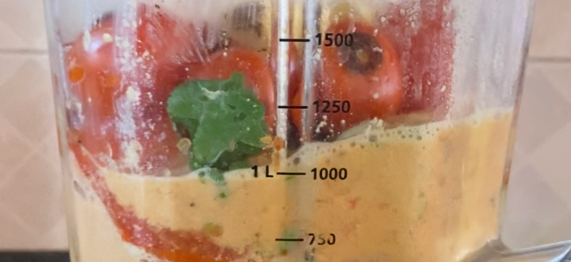 Opečenou a vychladlou zeleninu vložíme do mixéru, přidáme trošku čerstvého koriandru (větší část si necháme na potom) a rozmixujeme dohladka. Pokud je potřeba, můžeme přilít trošku vývaru z masa. Vytvořenou omáčku přelijeme do čistého hrnce.